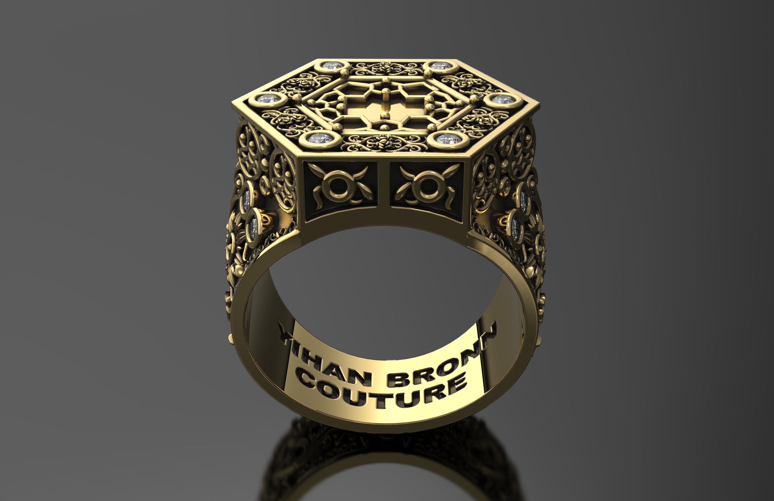 Command attention with the Yihan Bronn Hexagon Sovereign Ring, a masterpiece of intricate craftsmanship and regal design. This striking piece features a bold hexagonal silhouette, adorned with meticulously sculpted details and sparkling accents. The ring’s surface is richly textured with ornate patterns, reminiscent of classic heraldic designs and architectural embellishments. Each facet of the hexagon is carefully crafted, showcasing a blend of floral motifs, geometric patterns, and delicate cubic stone settings. Choose between the opulent warmth of Gold or the refined elegance of Silver to perfectly complement your personal style. The hexagonal shape and intricate detailing create a substantial, statement-making design that is sure to turn heads. The interior band is engraved with “Yihan Bronn Couture” a mark of it’s exclusive design and exceptional craftsmanship. This ring is more than just an accessory, it’s a symbol of sovereign style and timeless elegance.